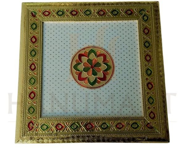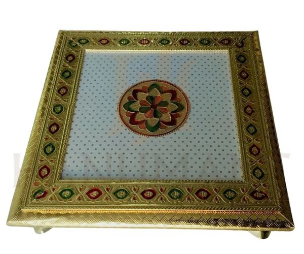 This chowki features a classic square shape with intricate patterns and a decorative center motif. The elevated structure ensures stability and ease of use during rituals.