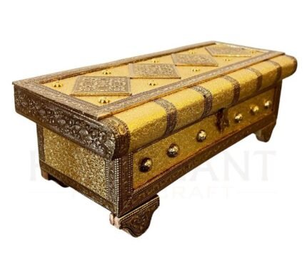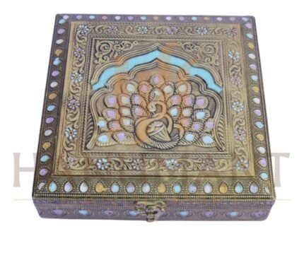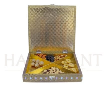 Crafted for both beauty and durability, the box features a secure lid and four spacious compartments, allowing neat storage of dry fruits, sweets, chocolates, or small gift items. Its royal gold aesthetic enhances the perceived value of any gift hamper.
