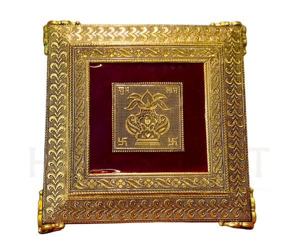 Elegant metal pooja chowki with traditional embossed design, ideal for placing idols, kalash, and pooja items in home mandir.