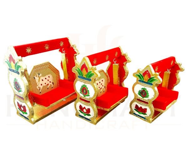 Bring divine charm to your home with this Handcrafted Laddu Gopal Jhula featuring a delicate cow motif in vibrant red and gold. Expertly crafted by skilled artisans, this pooja swing is perfect for adorning your mandir or home temple. Its intricate design and durable construction make it ideal for daily worship, festive celebrations, and traditional gifting. Elevate your devotional décor with this beautiful swing that blends spiritual elegance with timeless craftsmanship.