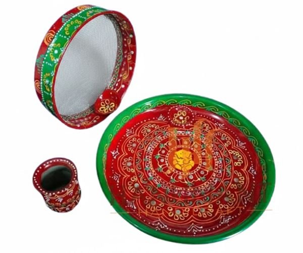 Elegant hand-painted pooja thali set including decorative chalni (sieve) and kumkum holder. Perfect for Karwa Chauth, festive rituals & bulk gifting.
