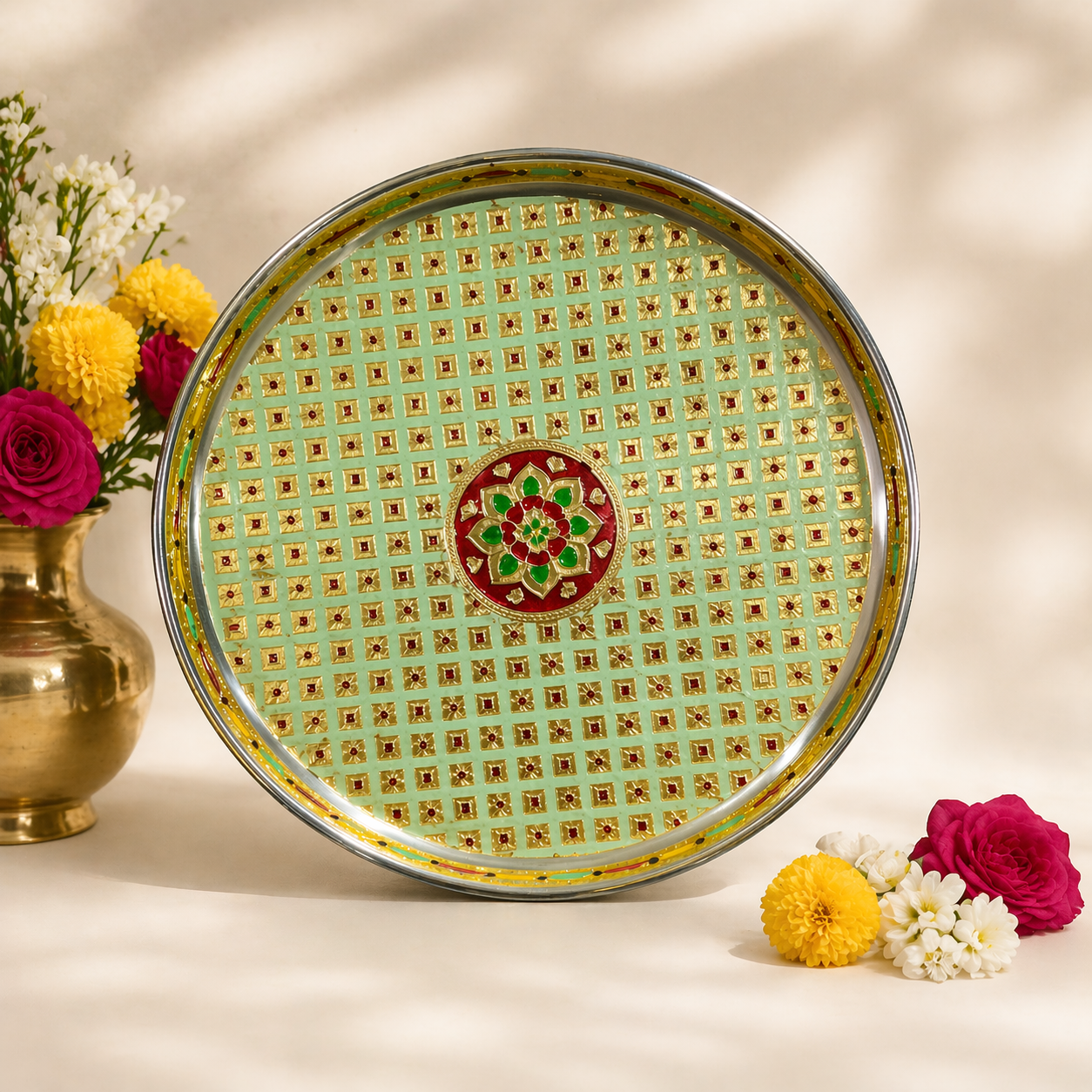 Green Pooja Thali Set Stainless Steel | Meenakari Aarti Plate for Mandir & Gifting
