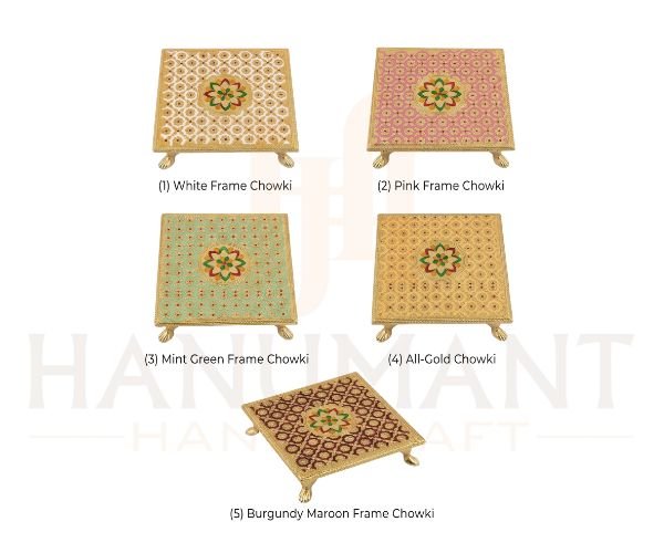 We offer the Meenakari Metal Chowki in a stunning array of colors to match your home decor. You can choose from classic Golden, deep Maroon, elegant White, vibrant Green, or soft Pink. Every piece undergoes a meticulous manufacturing process in our Jasdan unit. Our artisans hand-apply the enamel to ensure that the intricate floral and geometric patterns are perfectly detailed. Furthermore, the high-quality metal foil wrapping protects the underlying wood, ensuring your chowki remains a part of your family rituals for years to come.