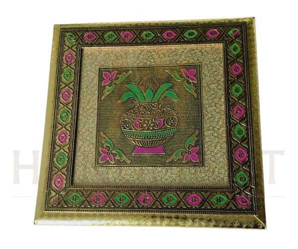 We take immense pride in the detailed craftsmanship of every Kalash Pooja Bajot. Our artisans in Jasdan hand-apply vibrant pink and green enamel work to the embossed metal foil. Consequently, the light reflects beautifully off the golden surface, creating a festive glow during your ceremonies. Furthermore, the design makes this specific platform a favorite for specialized rituals like the Bhaat ceremony and housewarmings.