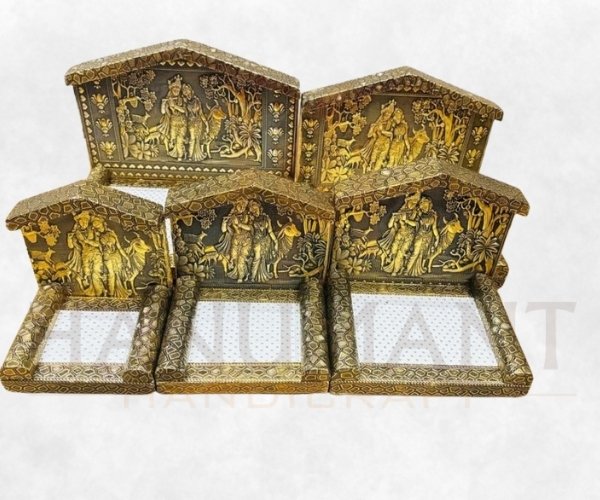 Enhance the beauty of your home temple with this Radha Krishna God Singhasan featuring a traditional embossed design and elegant golden finish. This decorative mandir singhasan provides a divine seat for placing Krishna, Laddu Gopal, Radha Krishna, and other deity idols during pooja and festivals.